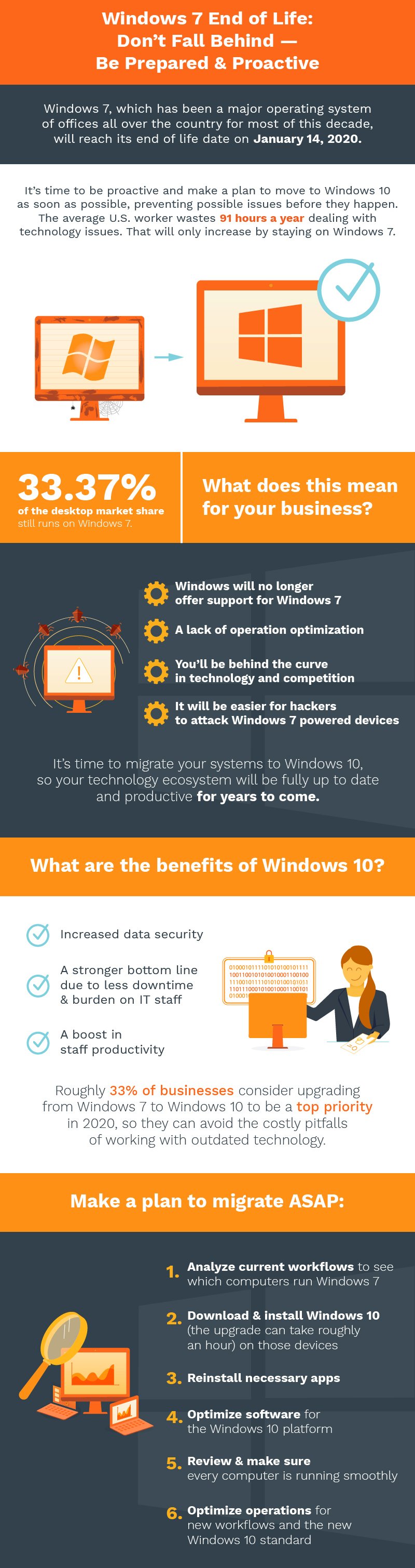 Upgrading to a new operating system is one of the best ways to combat any potential problems that may occur after Windows 7 end of life commences. Around 33% of businesses consider migration to Windows 10 to be a top priority by 2020. If you have not done so already, you too should also consider migrating from Windows 7 to Windows 10 as soon as possible. While many Windows 7 users may not be alone in using a soon to be outdated system, they are falling behind in urgency to protect their operating system in a timely fashion. Another one of the best defenses against software failures and malware attacks in order to combat an outdated operating system is to outsource a team of IT experts that will constantly protect and monitor your operating system and provide your business with new and modernized tools necessary to compete at a competitive level. In the end, the most important thing to prioritize and keep top of mind while making decisions based on this change is to have a solution in place that constantly monitors and manages your entire IT network. With this as a priority, choosing a solution that makes sense within the context of your business strategy, goals, and budget will put you ahead of the majority of businesses running on Windows 7.