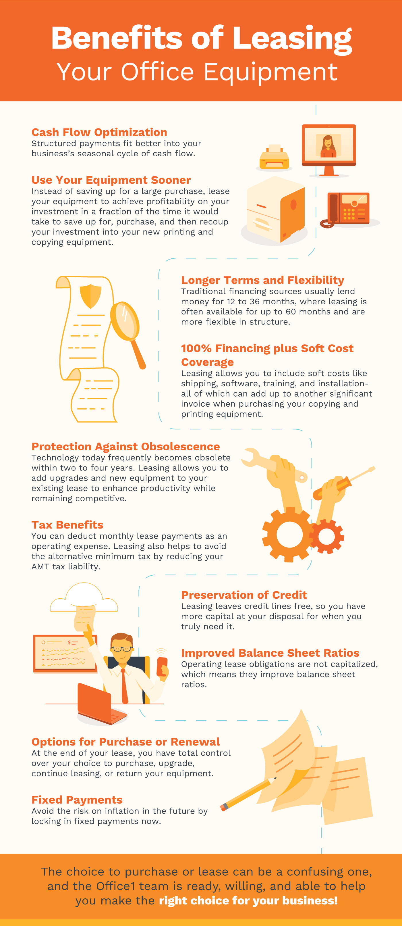 If you answered yes either question, you should consider leasing. Leasing options allow for easier cash flow and more flexibility for growing businesses. Instead of tying your cash up in equipment, you can use it for other growth opportunities, like sales and marketing. Here are the top 10 reasons a business should consider leasing their copying and printing equipment: